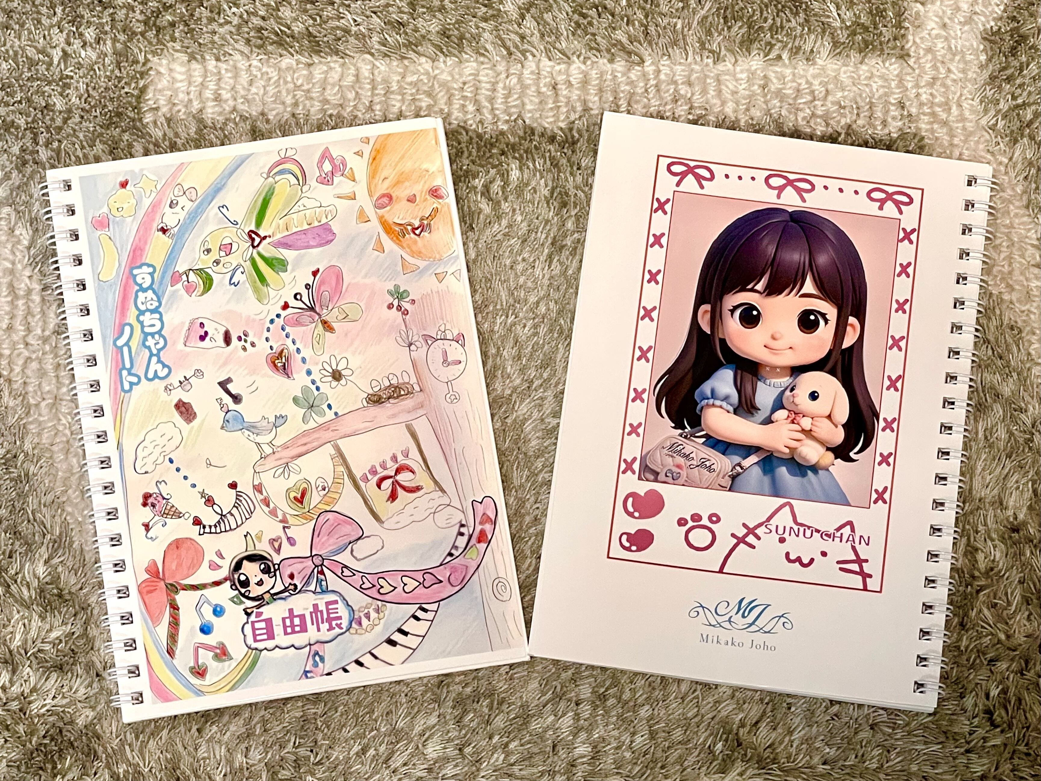愛娘のすぬちゃんが母の楽曲「ハートリボン」をテーマに描いたオリジナルイラストを表紙にした真心こもったオリジナルノート。イラストは愛娘、色は母が手掛けた母娘共作のオリジナルノートです♪